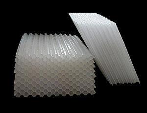 六角形蜂窝填料(斜管填料)材质有聚丙烯(pp)聚氯乙烯(pvc)乙丙共聚三种。组装形式的斜管和直管两种形式。