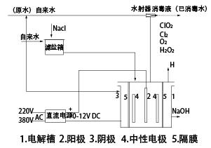 2、工作原理(见基本原理图):将一定浓度或饱和盐液加入电解槽阳极室,同时将清水加入电解槽阴极室,接通12V直流电源开始电解,即可产生CLO2、CL2、O3、H2O2等混合消毒剂,经水射器负压管路将气体吸入水中消毒。