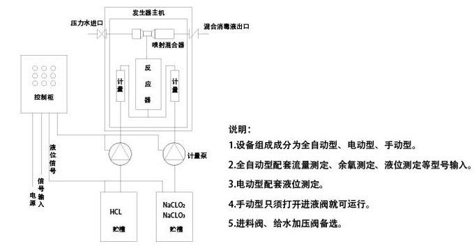 以上反应的原料经各自应的计量装置,准确计量后投入进入反应器中、反应生成二氧化氯气体,经射流器抽吸与水混合制成高效的二氧化氯消毒液。