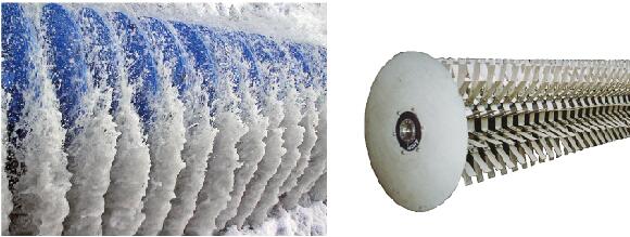 该设备为卧轴式表面曝气设备,刷片均匀地布置于主轴上,当驱动装置驱动主轴转动并带动刷片开始旋转,刷体与水接触,将水抛入空中,形成水跃,充分与空气接触,空气迅速深入水中,从而完成充氧过程,并推动水流在氧化沟内循环流动。