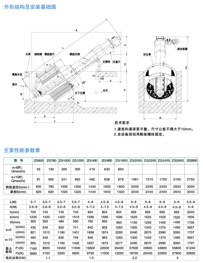 本机由栅格筐、螺旋提升机、螺旋压榨机、齿耙机构、清齿板、支撑架、出渣管等部件组成,因工作特殊,具有以下特点: