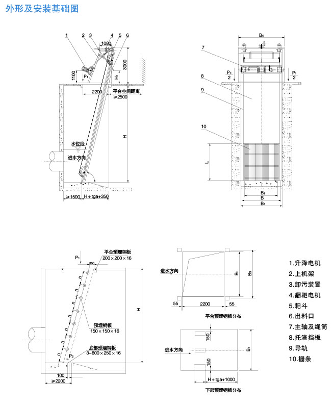 该设备的机架固定在井口上端,由固定栅条组成过水栅面。当污水流经栅面,大于栅隙的杂物被拦截。耙斗先由翻耙电机驱动,完成开翻动作后停止,再由升降电机驱动,并在高度限制器的控制下,沿两侧导轨下降至格栅井底部后停止,并再次自动开启翻耙电机,完成台耙动作后停止。升降电机又再次启动,耙斗在钢丝绳的牵引下,插入栅条间隙中,将拦截的杂物捞起,并沿着栅面、挡渣板上升,在高度限制器控制下,在到达卸料口位置后,升降电机停止。上机架处的清污刮板随耙斗的上升动作自动将杂物刮除,从卸料口中落入输送机或垃圾小车上,一次清捞过程完成。