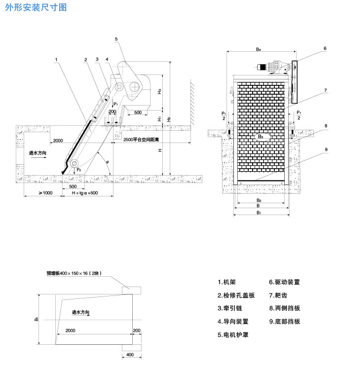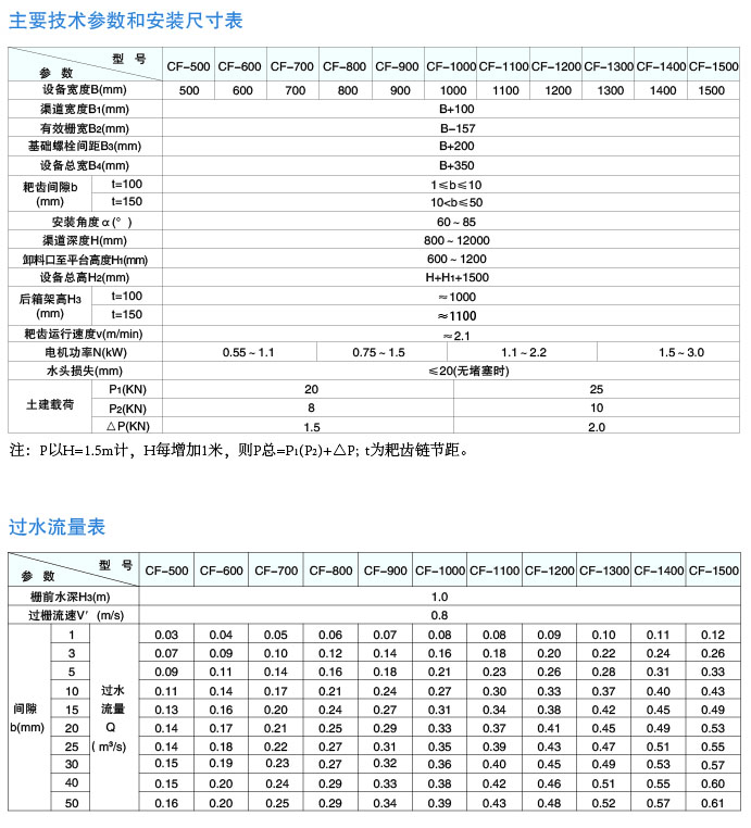 3、耙齿规格两种,粗格栅耙齿节距t=150mm,细格棚耙齿节距t=100mm。